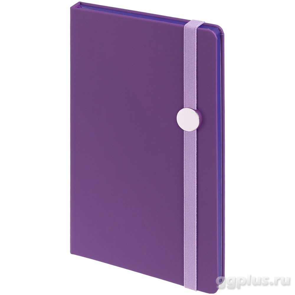Блокнот в твердой обложке, выполнен из материала Soft Touch, фиолетовый UU, дополнен резинкой и ляссе в цвет обложки.