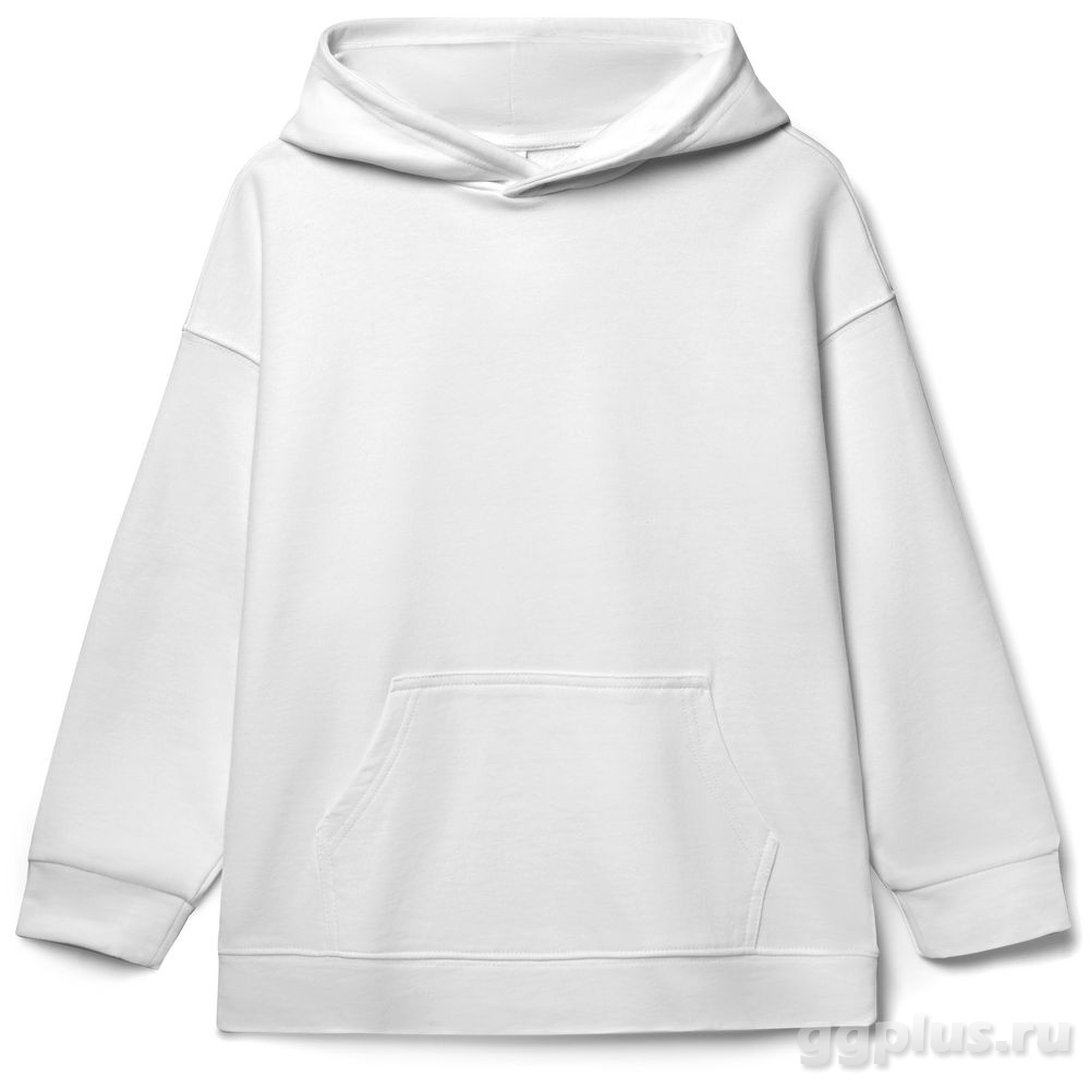 Детское худи оверсайз со спущенным плечом и карманом-кенгуру.