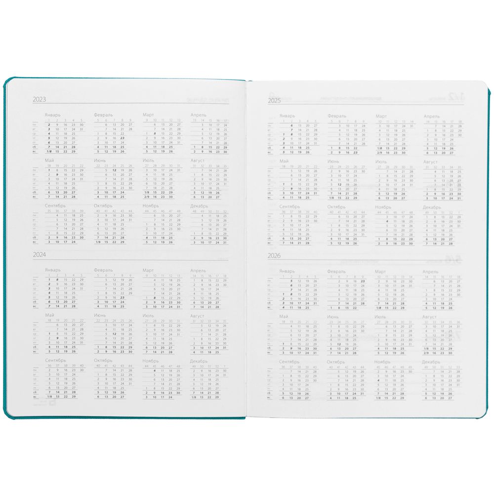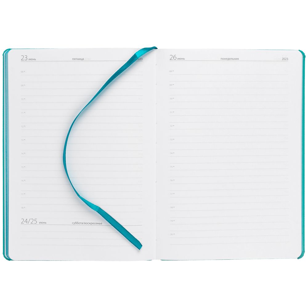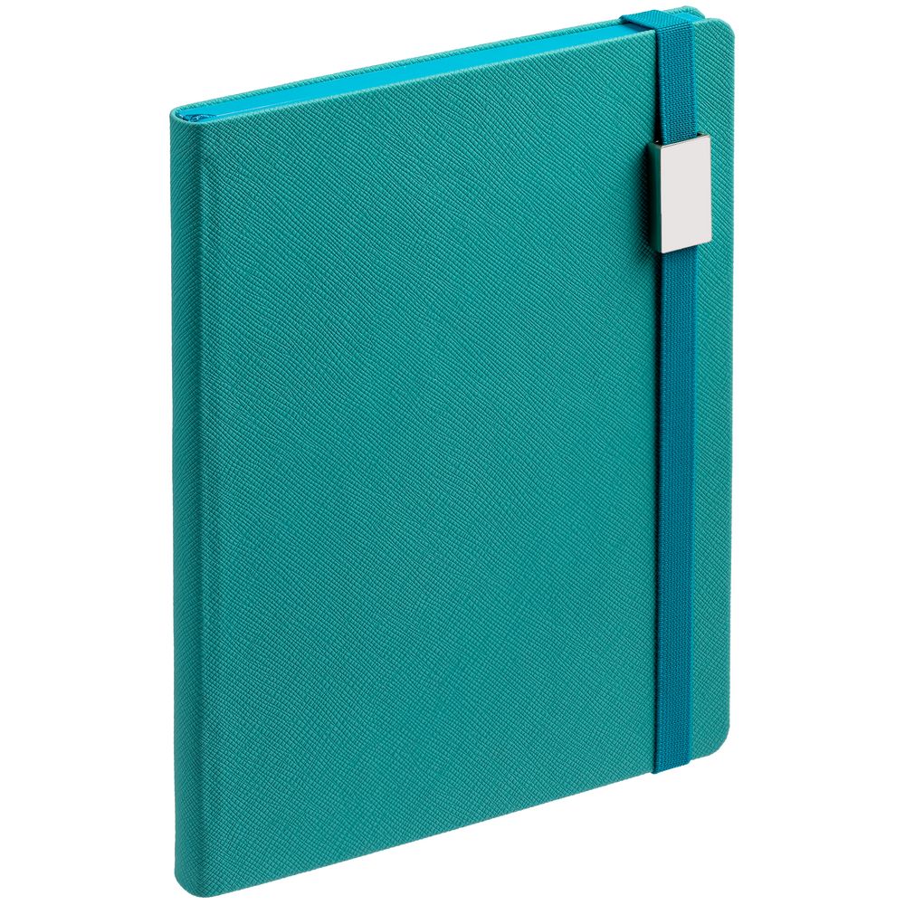 Ежедневник с полутвердой обложкой выполнен из материала Nice Touch, морская волна II, и дополнен резинкой шириной 1 см с металлическим шильдом и ляссе в цвет обложки.