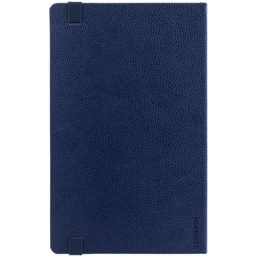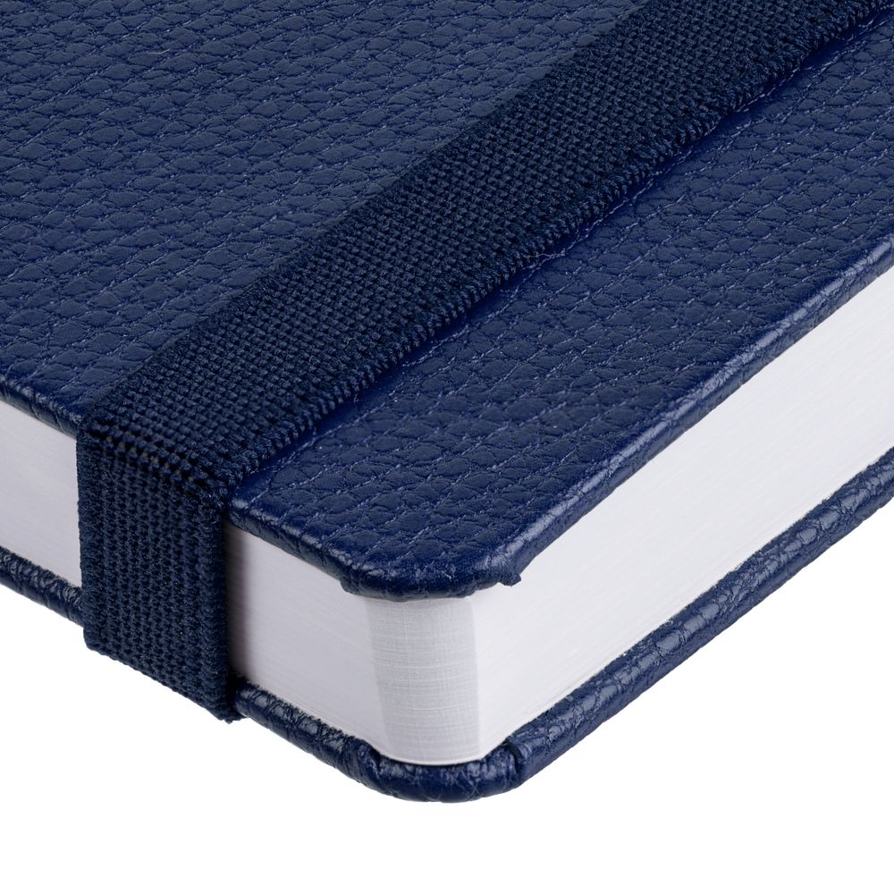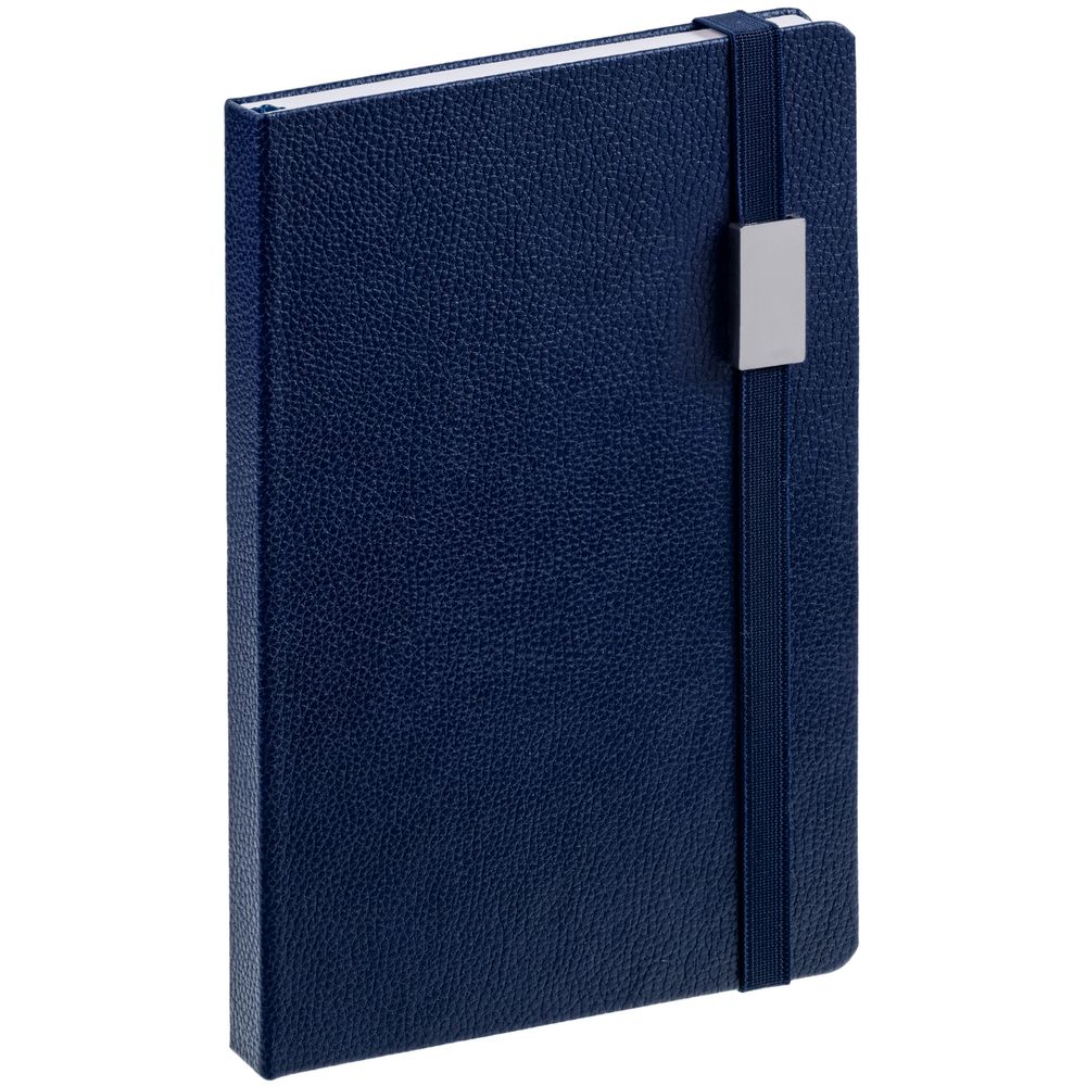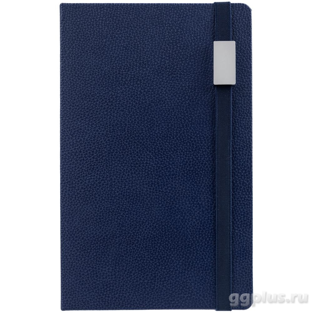 Ежедневник с твердой обложкой, выполнен из материала LaFite, синий НН, дополнен резинкой с металлическим прямоугольным шильдом и ляссе в цвет обложки.
