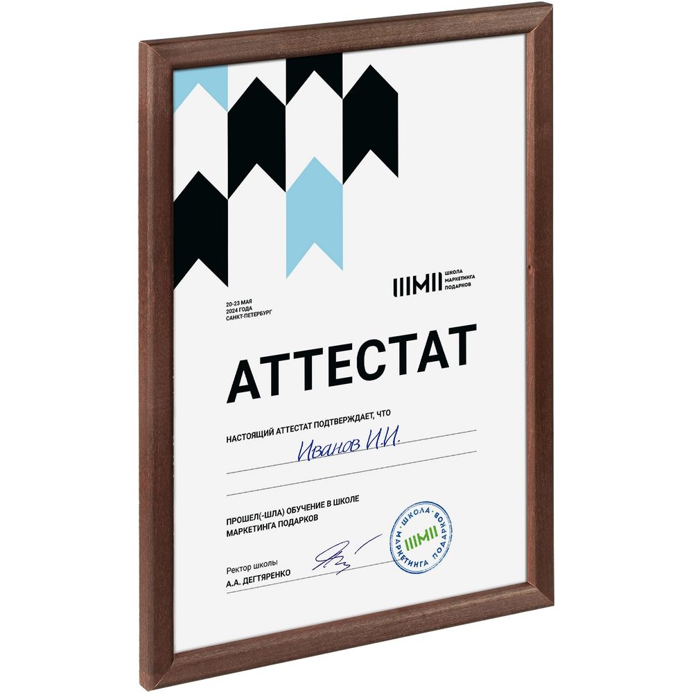 Рамка в благородном цвете венге идеально подчеркнет значимость любых достижений, а также поможет прекрасно оформить фотографии, сертификаты, лицензии и другие композиции. Поставляется в термоусадочной пленке.