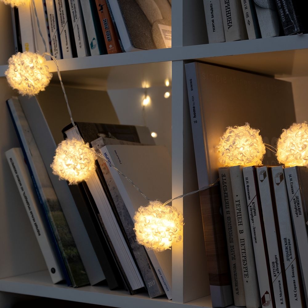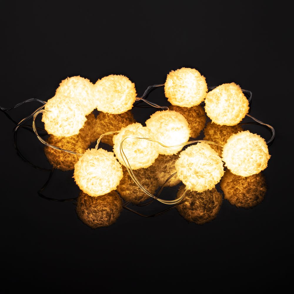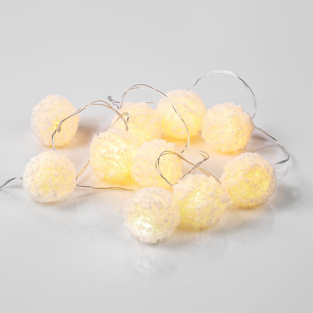 10 пушистых шариков с лампочками теплого света. Работает от 2 батареек АА (в комплект не входят).