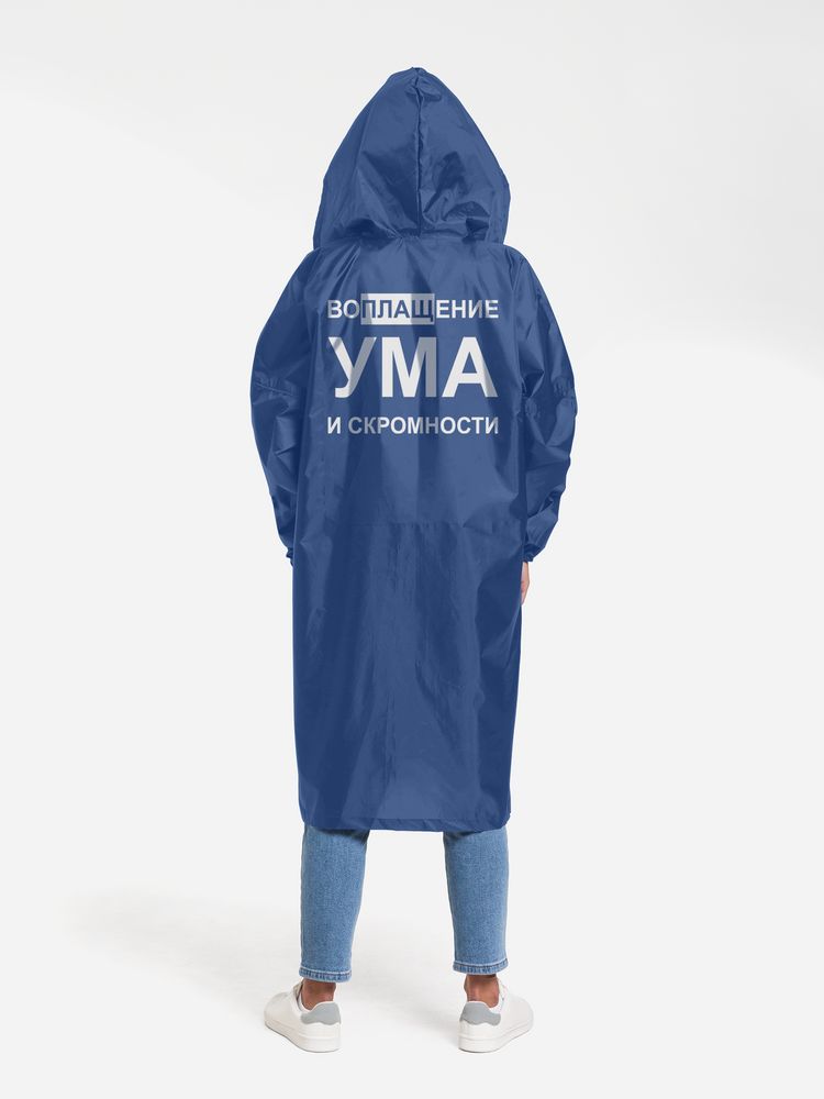Серия дождевиков с принтом «Воплащение» для тех, кто и в дождливую погоду готов преображаться и шутить. Ум и скромность, красота, а может быть порок? «Воплащение ума» — плащ гениальных людей, осознающих свое превосходство, но принимающих похвалу с присущей им скромностью.Плащ-дождевик из ткани таффета на молнии с капюшоном. Складывается в мешочек — удобно брать с собой.