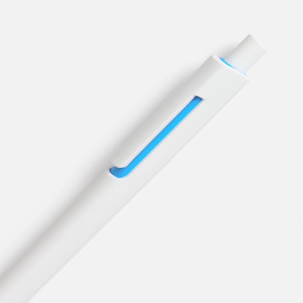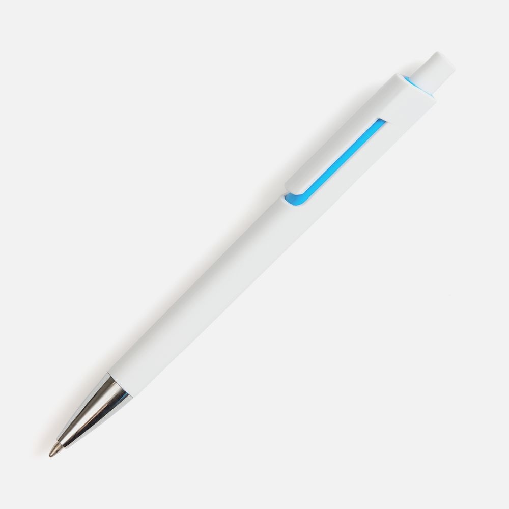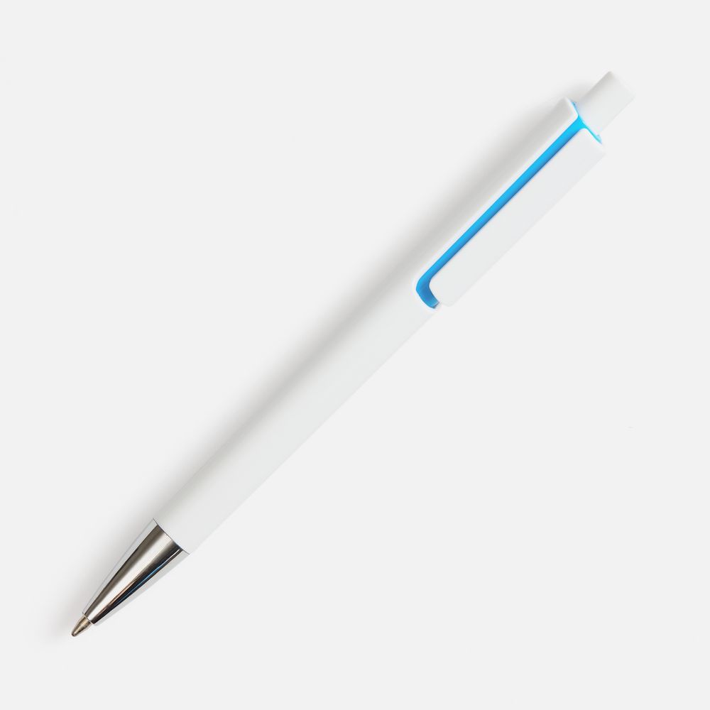 Шариковая ручка с глянцевым белым корпусом и цветовым акцентом у клипа, который дополнит логотип компании.
