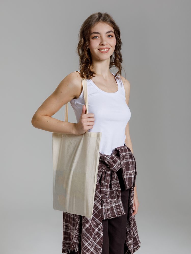 Классический шопер из переработанного хлопка. Неокрашенное полотно делает сумку настоящим универсальным холстом для логотипов и других маркетинговых сообщений.Способ обработки внутреннего шва: оверлок.