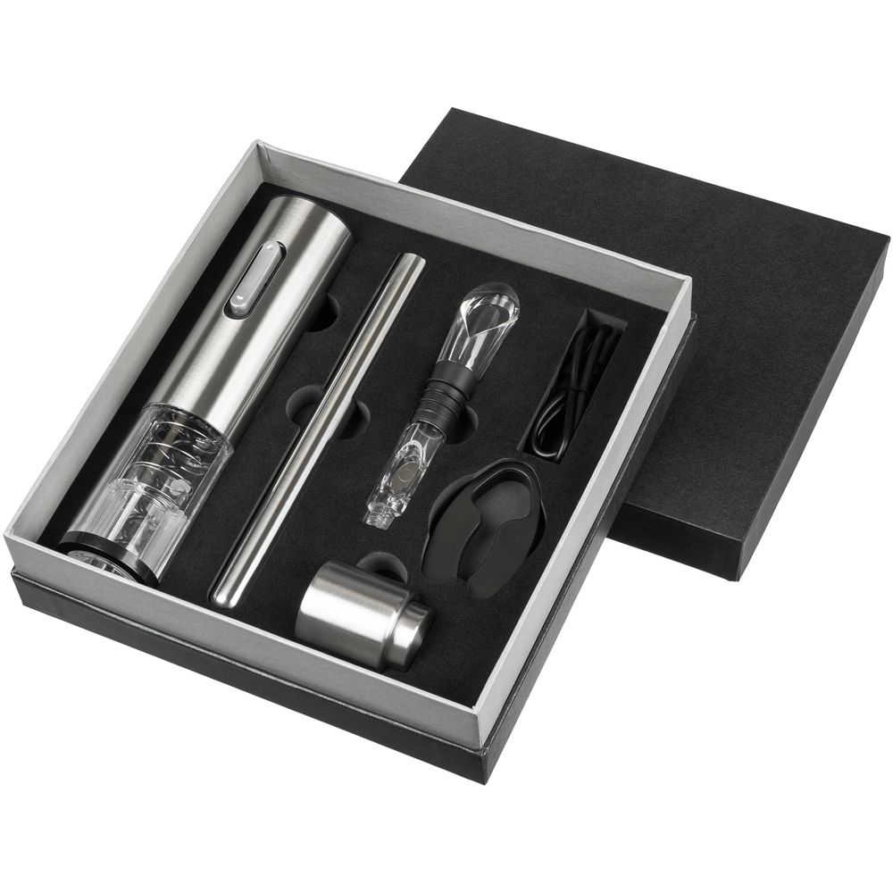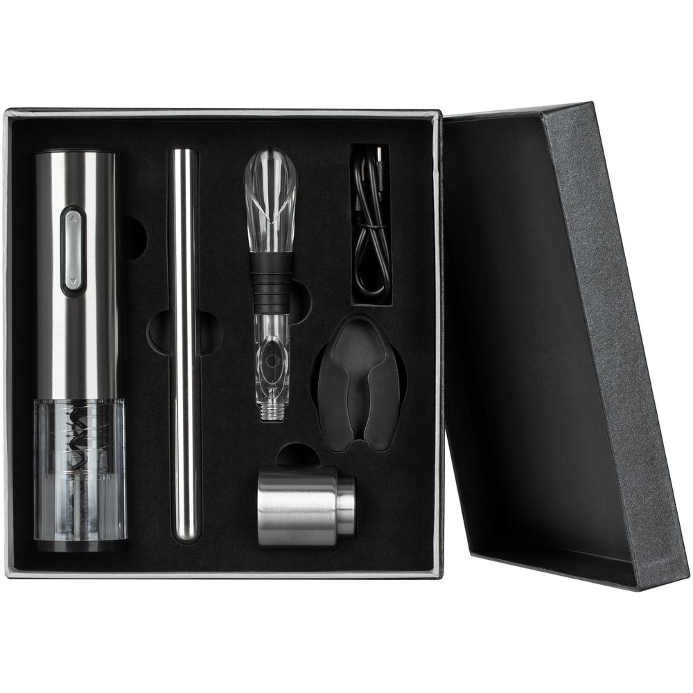 Набор Wine Diesel — настоящая находка для ценителей вин. Благодаря продуманному дизайну использование автоматического штопора практически не требует участия человека. Изящный чиллер поддерживает температуру напитка до часа, удобная разливочная воронка дополнительно аэрирует вино и не позволяет пролить его мимо бокала, а небольшая вакуумная пробка сохраняет вкусовые свойства напитка в течение нескольких дней.